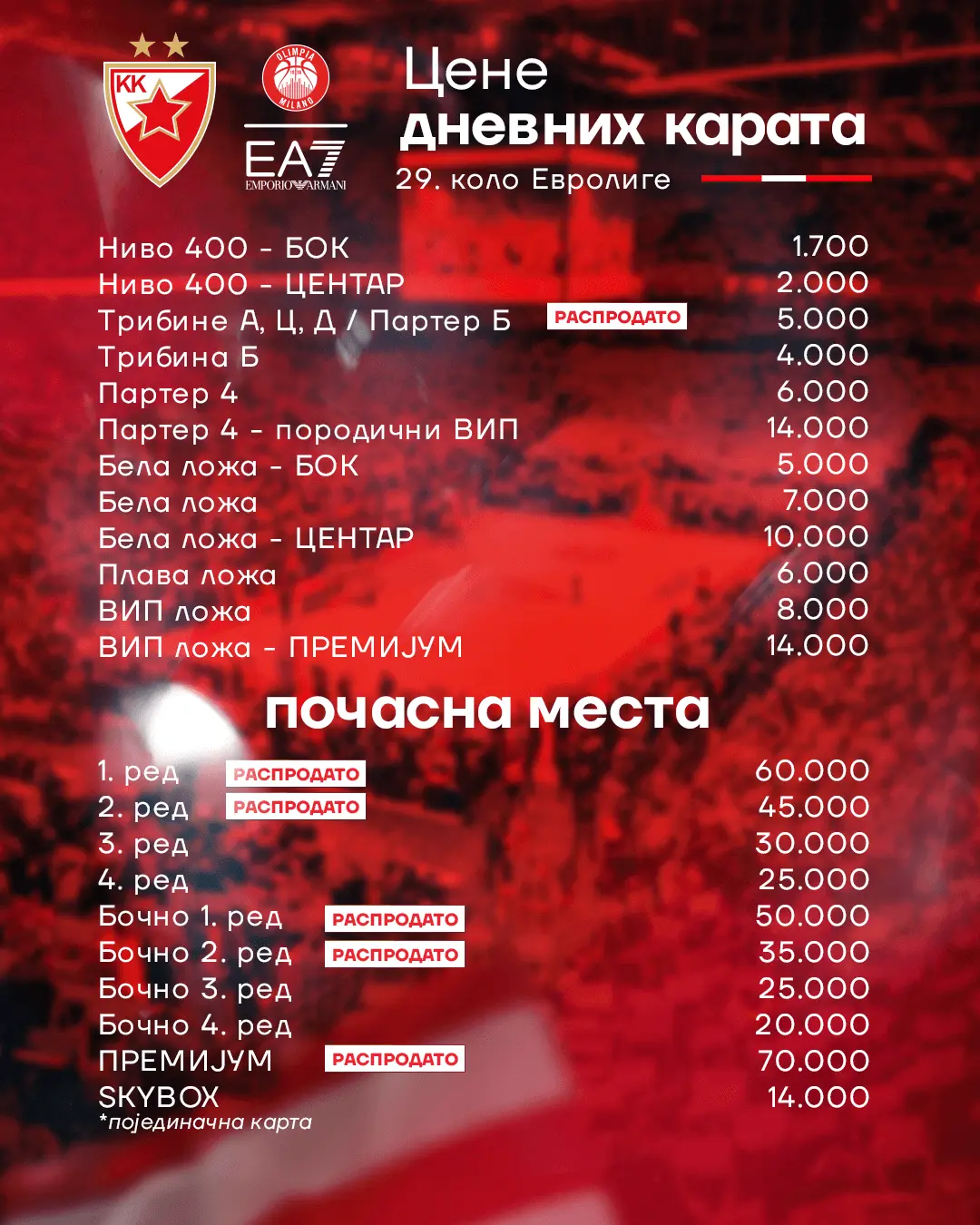 Kompletne cene karata za utakmicu 29.kola Evrolige protiv Armanija možete pogledati ispod: